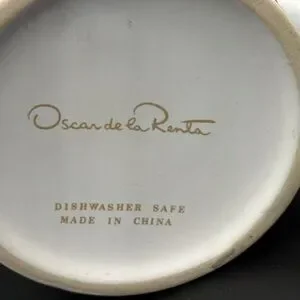 Oscar de la Renta was a renowned fashion designer who expanded his brand into home goods and lifestyle products in the 1980s and 1990s. These ceramic mugs were produced as promotional items and gift-with-purchase offerings for the Oscar de la Renta cosmetics and fragrance lines. The mugs feature the designer's signature script logo and elegant gold swirl motifs that reflect the brand's luxury aesthetic. These pieces appeal to collectors of designer homeware and fans of Oscar de la Renta's legacy. While not rare, they represent an era of fashion brand expansion into lifestyle categories and maintain modest collectible value.