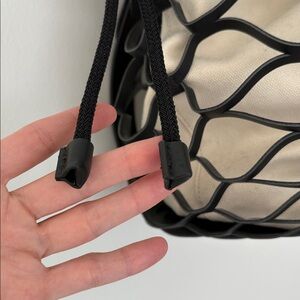 Buffed leather tote in black. Net-style construction, twin detachable and adjustable shoulder straps with post-stud fastening at top face. Detachable off-white canvas lining featuring drawstring closure, press-stud fastening, and twin carry handles. Silver-tone hardware. Excellent used condition.