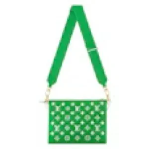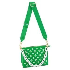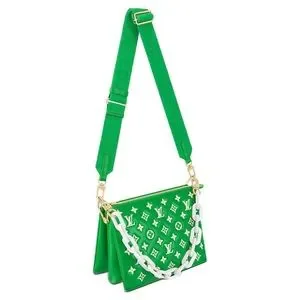 Evocative of the world of tennis, this brightly colored Coussin PM handbag is made from Monogram-embossed puffy lambskin with a chunky chain in contrasting white acetate, like the white lines on a tennis court. The chain enables shoulder carry while a wide shoulder strap allows shoulder and cross-body wear; both are detachable.