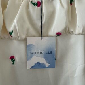 Chic cream dress adorned with pink floral details. Features a gathered waist for a stylish look.