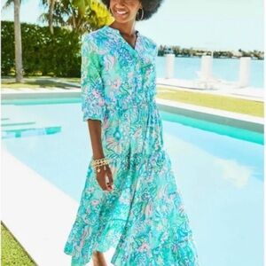 Lilly Pulitzer Cori Stretch Midi Shirtdress-Aqua La Vista