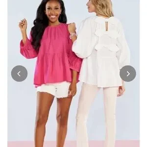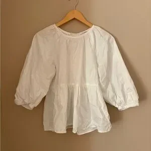 Keywords: Mud pie, women's blouse, white blouse, balloon sleeves, bow accents, casual wear, relaxed fit, tie closure, pre-owned, versatile top, Mud Pie, small size, bubble sleeves, back bow ties.