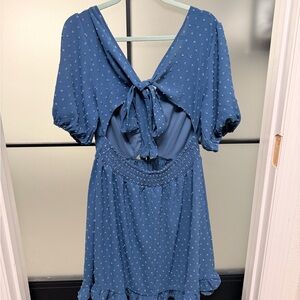 Soft romantic dress in a beautiful dusty blue with textured swiss dot fabric. Features puff sleeves, ruched adjustable front tie, subtle front cutout, smocked waist for stretch, and an open back with tie closure. Finished with a flirty ruffle hem.