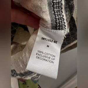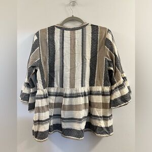 Stylish striped top with ruffle sleeves. V-neckline with button detail. Perfect for casual wear. Pit to pit measures 20 inches shoulder to hem is 23 inches.