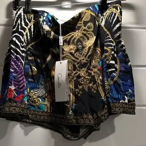 Chic high waist shorts with intricate black and gold patterns. Features vibrant accents for a bold look. Ideal for stylish outings.