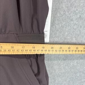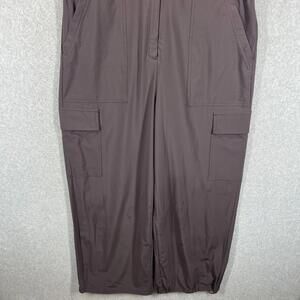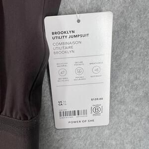 The Athleta Brooklyn Jumpsuit in size 16 is a stylish and comfortable one-piece outfit perfect for travel and casual occasions. This athleisure jumpsuit features a V-neckline, zip closure, and a sleeveless design, making it ideal for warm weather during the summer, fall, and spring seasons. Made from a blended fabric of polyester and spandex, this jumpsuit is lightweight and offers a relaxed fit for an athletic look. With a solid brown color and convenient pockets, this jumpsuit by Athleta is a versatile and trendy addition to any woman's wardrobe.
