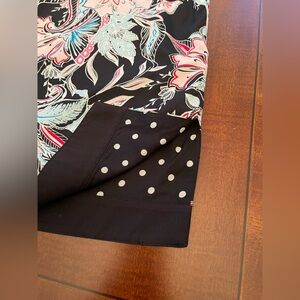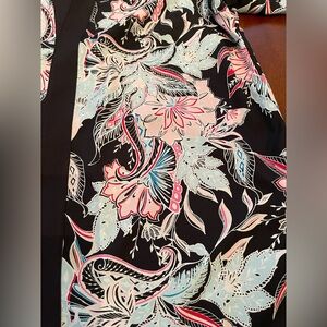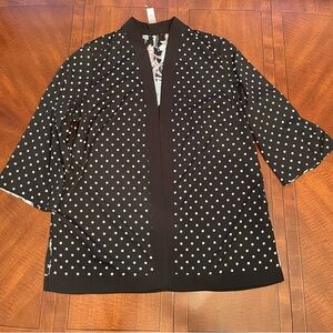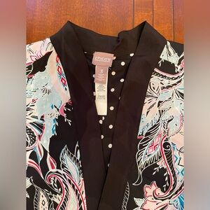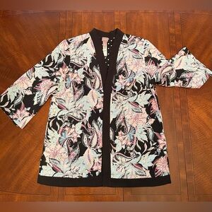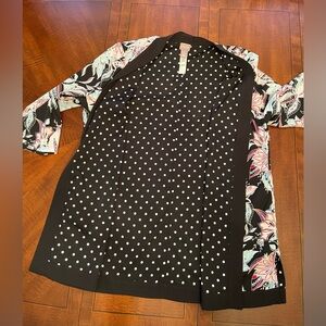 Chico's colorful lightweight, open front jacket cardigan. It features a vibrant tropical floral print on a black background with pink and light blue accents. It is reversible into white on black polka dots design.