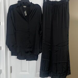 Features: Top: Relaxed, drop-shoulder sleeves, collared neckline, button front closure; Bottoms: Mid-rise, wide leg, elastic waistband with drawcord