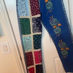 These vibrant straight leg jeans feature a unique patchwork design, perfect for making a bold fashion statement. The colorful patterns add a playful touch to any outfit.