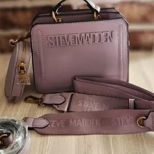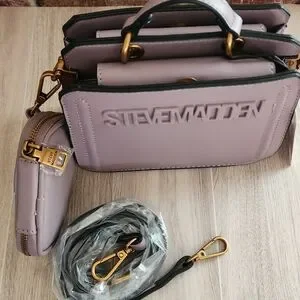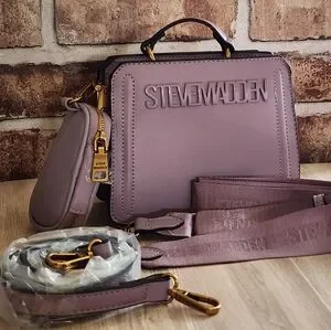 The Steve Madden Bevelyn is a structured, small convertible crossbody bag. It features a top carry handle with a 2.25" drop, a removable 23" drop crossbody strap, two main compartments, and often comes with a detachable, smaller zip pouch.