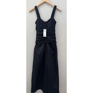 The Me+em Mixed Media Dropped Waist Ruched Maxi Dress in black, size 2, is a stylish and versatile piece perfect for both party and casual occasions. This sleeveless dress features a solid pattern, pullover closure, and is made of a blend of tencil, cotton, and elastane for comfort. The long maxi length and ruched details add a touch of sophistication to this elegant and fashionable dress from the brand Me+Em.