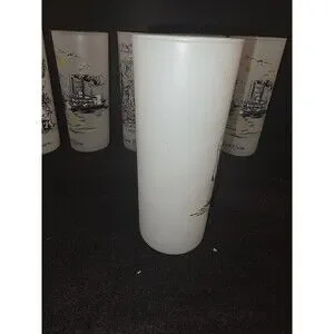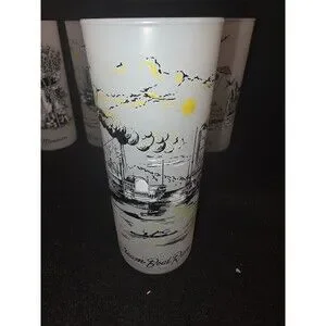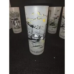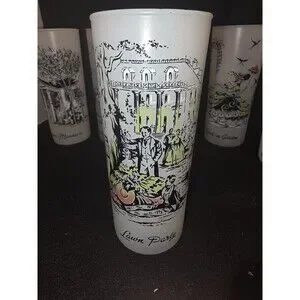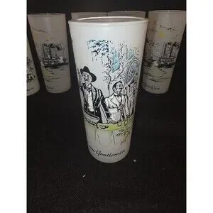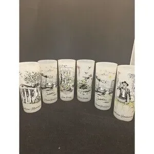 Bring a piece of vintage Americana to your glassware collection with this set of 6 original Libbey frosted "Southern Hospitality" glasses. These highball/Tom Collins style glasses feature beautiful, multicolored nostalgic illustrations of life in the Old South.