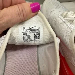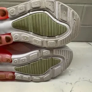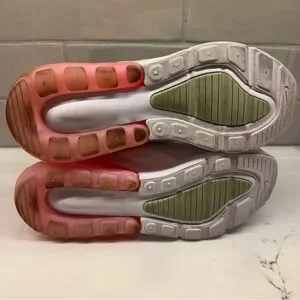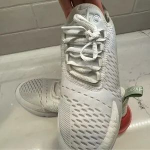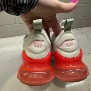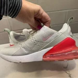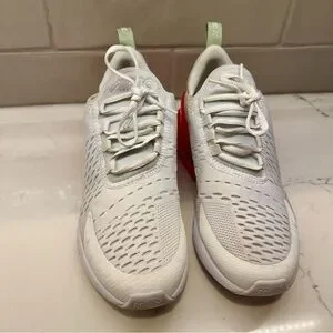 Nike Air Max 270 sneakers in white with pink swoosh and neon coral Air unit. Youth size 6Y (fits women’s 7.5).