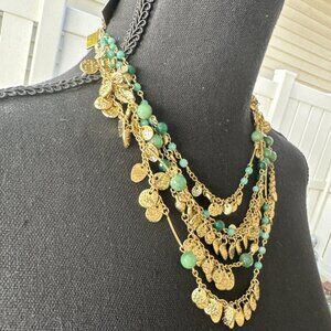 NWT Nordstrom Sequin Brand Gold Tone Multistrand (5) Beaded Necklace. Beautiful necklace with round, textured, medallion gold charms and teal-colored green beads. Measures approx 18 1/2" with a 2 1/2" extender. Retails for $125.00.