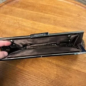 1 small interior pocket & fastens at top with metal clasp Embossed with Olga Berg name.