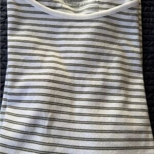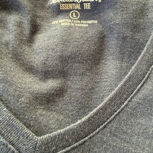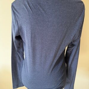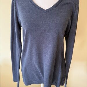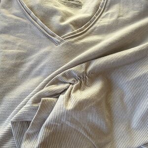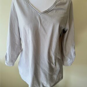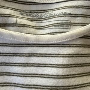 Eddie Bauer women’s set of 4 large shirts. One heather blue long sleeve v-neck. One 3/4 sleeve black shirt. One black/white striped 3/4 sleeve. One light tan stripe striped 3/4 sleeve shirt. This one has a rouched sleeve detail.