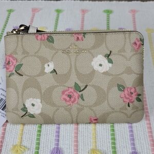 The NWT wristlet is a floral print on monogram light khaki coated canvas. Corner zipper with white wristlet strap. Measures 6in. x 4in.