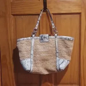 Chic Coach shoulder bag with a woven tan body. Accented by stylish gray trim. Perfect for versatile wear.