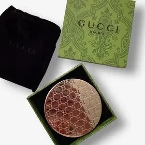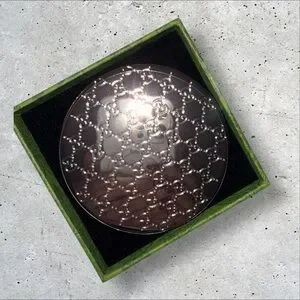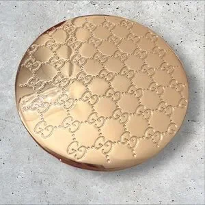 An elegant and collectible piece from Gucci Beauty, this compact mirror showcases the house’s iconic interlocking GG pattern in a reflective metallic finish. Crafted with a luxurious high-shine gold-tone case, it opens to reveal a pristine double mirror — perfect for touch-ups or display.