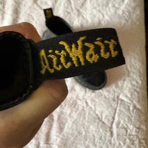 Dr. Martens smooth black lace-up boots in size 7, featuring yellow welt stitching, scripted heel loop, and a unique sole tread. These durable boots have a wide, rounded toe shape and grooved, air-cushioned sole. The upper is 100% leather; the inner is 25% leather and 75% textile; the sole is 100% PVC.