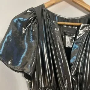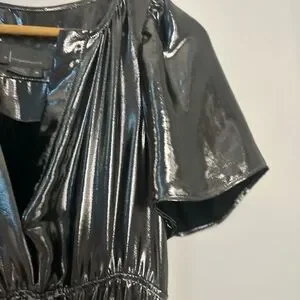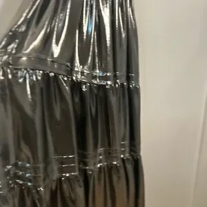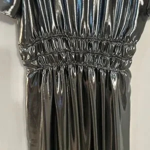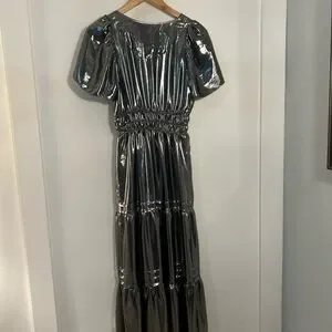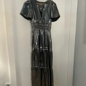 Dazzle in this shimmering metallic silver maxi dress. Perfect for evening elegance. Flowy and stylish design.