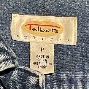 Keywords: Talbots Petites denim jacket, Women's blue denim jacket, Classic denim jacket, Button front denim jacket, Casual outerwear, Petite women's jacket, Everyday denim jacket, Layering jacket, Cotton denim jacket, Versatile jacket, Timeless fashion