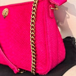 Kurt Geiger London Kew Pouch Shoulder Bag featuring vibrant fuchsia leather, a signature jeweled eagle's head embellishment, and removable gold-tone chain straps