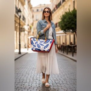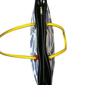 This stunning Henri Bendel tote is a rare find from their iconic West 57th collection. Known for its bold "Blue Feather" graphic print and vibrant color-blocking, this bag is the perfect statement piece for spring and summer.