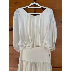 New with tags Elena Baldi elegant 2-piece set in a soft cream tone featuring a silk blend fabric. Includes a sheer long-sleeve blouson top and a coordinating maxi skirt with an empire-style waistband for a flattering, feminine silhouette. Beautifully draped and fully lined for comfort and coverage. Lightweight yet elegant—perfect for special occasions, resort wear, bridal events, or elevated evening styling.