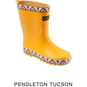 Stylish yellow rain boots with patterned trim. Perfect for rainy adventures.