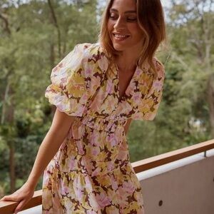 Anthropologie Minkpink Zoey Floral Pleated V Neck Short Sleeve Maxi Dress