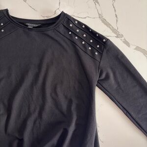 Elevate your style with this Rock & Republic black studded sweatshirt. It is characterized by its long sleeves, a crew neckline, and distinctive silver-colored stud embellishments on the shoulders. A notable design feature is the knot or twist detail located at the front hemline.