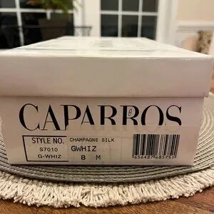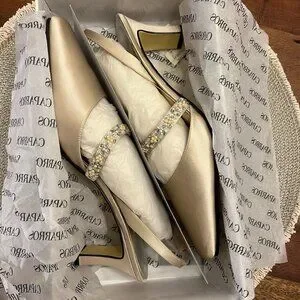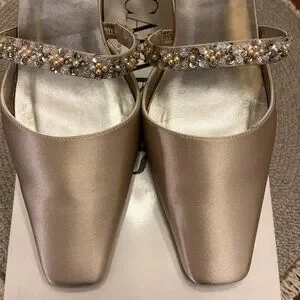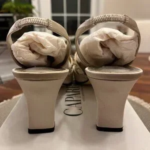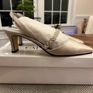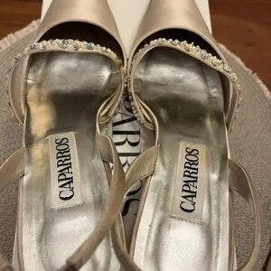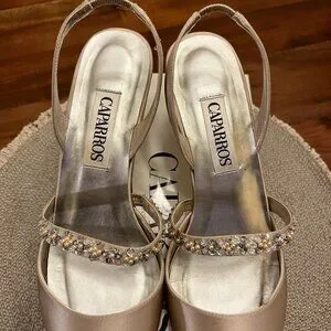 These are romantic and elegant Caparros G-Whiz slingback pumps, perfect for evening or bridal wear. Crafted in a luxurious champagne silk, these vintage beauties offer a sophisticated silhouette for a formal look, from bridal parties to gala events. With exquisite hand-beaded bridge strap, intricately embellished with shimmering rhinestones and pearls for a touch of old-world glamour. Pointed toe with elasticized slingback strap for a secure and comfortable fit. These shoes are perfect for a bride looking for a "something vintage", a bridesmaid, mother-of-the-bride, or as a classic companion to a cocktail or evening dress.