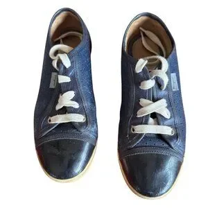 style: lace-up low-top sneakers; navy/blue leather; cream laces; gum sole; rubber toe cap