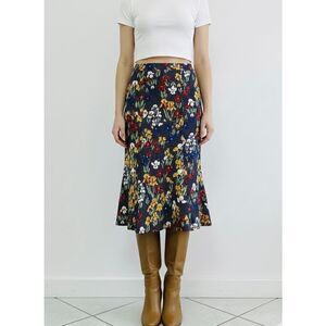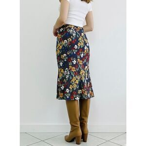 Add a touch of vintage charm to your wardrobe with this stunning jersey floral-printed midi skirt! Featuring a unique layered print of bright irises over a classic micro-polka dot background, this skirt is a total head-turner. It has a flattering high-waisted fit that hugs the hips before flaring out into a subtle trumpet hem. Whether you're styling it with 70s-style boots for a 'cool girl' autumn look or a white tee for a summer picnic, this piece is incredibly versatile.