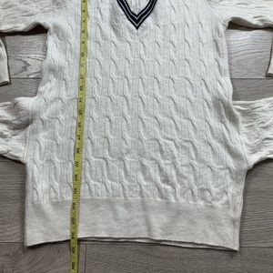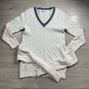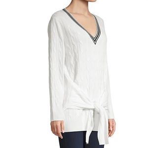 A stylish tie-waist design updates this cozy cable-knit sweater punctuated by a striped V-neck and ribbed cuffs.