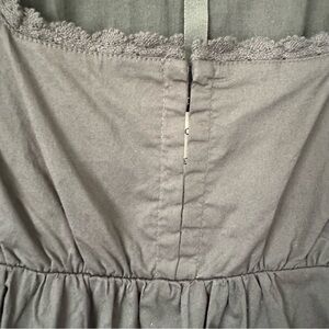 Babydoll silhouette, mini length, square lace trim neckline, hook and eye closures at front, lined, pockets.