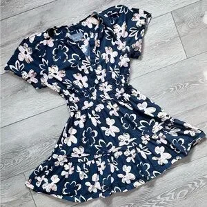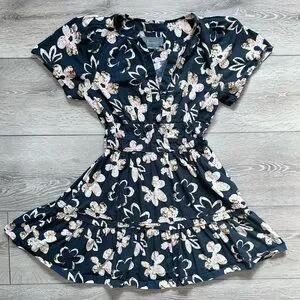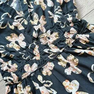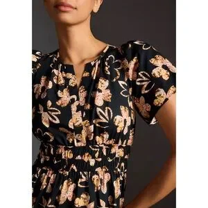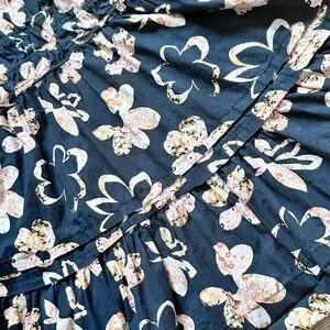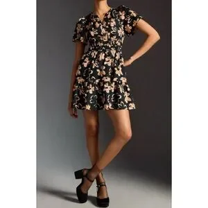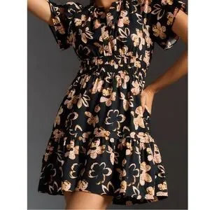 Adorable floral Somerset mini dress from Anthropologie. Black in color with orange & white floral print. V-neck with hook & eye closure. Elastic, double bands at the waist. Pockets on both sides. Made of 100% cotton.