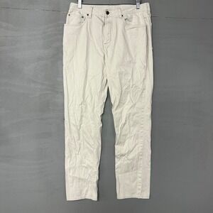 GenTeal five-pocket pants offer a versatile and classic look in a neutral stone or off-white shade. These trousers are constructed from a durable cotton-blend twill with a hint of stretch for all-day comfort. The design features a traditional zip fly with button closure, belt loops, and a signature leather logo patch on the back waistband. Ideal for casual outings or a refined weekend aesthetic, these pants pair effortlessly with polos or button-downs. Note: There are some visible dark marks/stains on the back left pocket and lower leg as shown in photos.