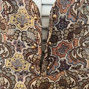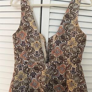 Chic mini dress with intricate multicolor pattern. Sleeveless design. Perfect for a stylish outing.