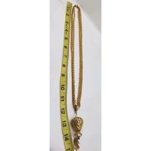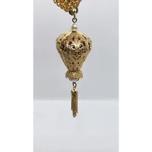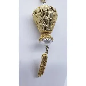 This is a vintage gold-plated necklace from the 1970s by the brand CELEBRITY. The necklace features a faux pearl pendant with a tassel design andis set on three chains. The style is pendant with a boho and art theme, making it a unique and fashionable piece. Perfect for adding a touch of vintage glamour to any outfit