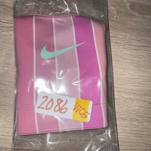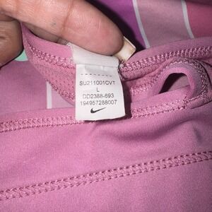 Nike Dri Fit reversible racerback sports bra in junior sizing. One side features solid pink with white Nike swoosh, the other side has pink and white vertical stripe design with contrasting swoosh. Dri Fit moisture wicking fabric helps keep you dry and comfortable. Racerback style allows full range of motion, perfect for sports, gym, dance, cheer, or everyday activewear. Gently used condition. Please review photos for details and approximate fit.