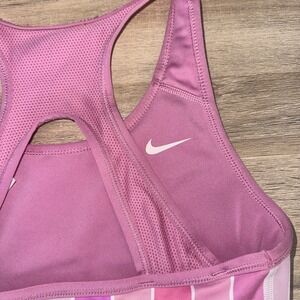 nike dri fit sports bra, junior nike bra, pink racerback bra, reversible sports bra, girls athletic top, youth nike activewear, striped sports bra, nike swoosh bra, youth workout top, girls gym bra