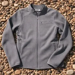 Design: The jacket has a full-zip front, a mock neck collar, and a ribbed knit texture.