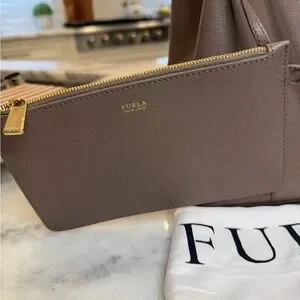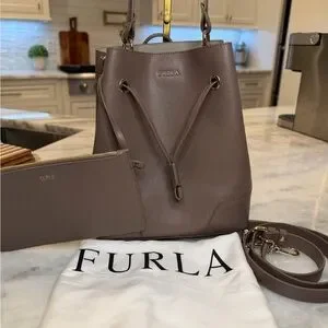 NWOT Furla Taupe Leather Bucket. Top Handle, Crossbody Strap, Pouch and Dust Bag are included. Size approximately 10” x 8.5”