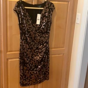 Elegant black dress with gold swirl pattern. Cap sleeves. Perfect for evening wear.