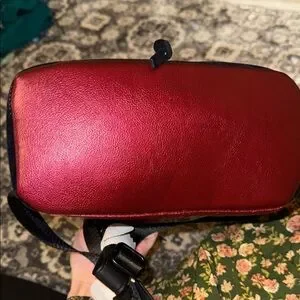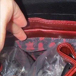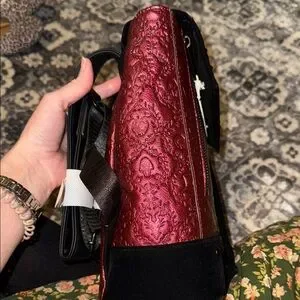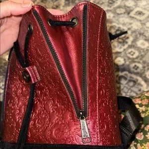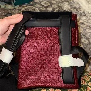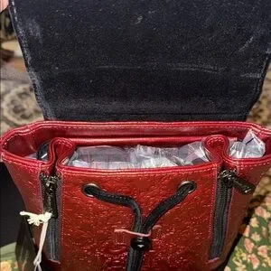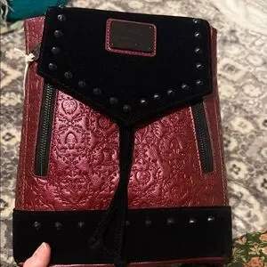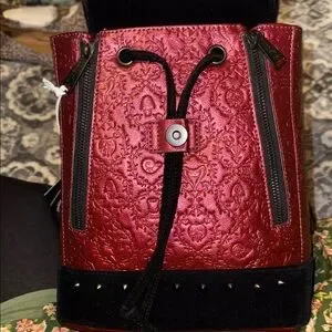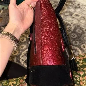 Features: Faux leather (polyurethane) with velvet trim, adjustable shoulder straps, debossed, metallic faux leather, stud cone, and printed details, coordinating interior lining.