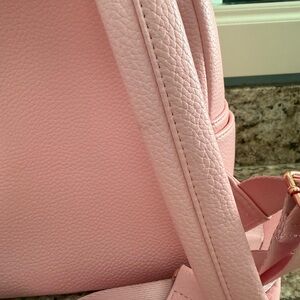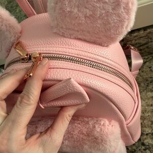 Charming Disney backpack with furry ears and bow. Soft pink design. Has a few marks but can easily be cleaned off. Zippers work, no stains.