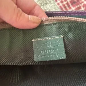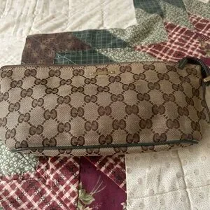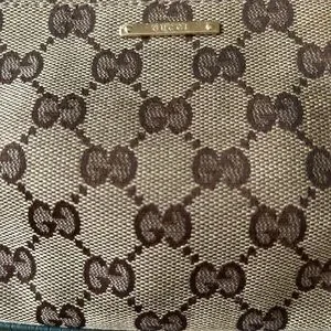 Stylish Authentic Older Gucci brown monogram clutch with a zip closure. Perfect for carrying essentials. Condition of bag is worn with slight discoloration. Older vintage model.