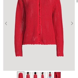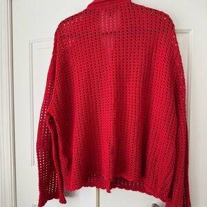 This long-sleeve cardi is crafted with an oversized fit from an open-knit blend of cotton and flax linen that makes it light, breathable, and effortless. Scalloped trims, a crocheted point collar, and fabric-covered buttons thoughtfully accent its breezy texture.